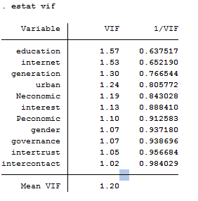 我里面包含的控制变量都是根据已知理论加进去的。然后我今天又根据理论加了另外两个控制变量,intertrust“人与人之间的信任程度”,intercontact “人与人接触的频繁程度”。然后做回归,generation依然不显著,新加进去的两个显著。如图,然后VIF值也都不大,都是1点多,又看了generation和这些控制变量的correlation,也没有大于0.5的。是不是这样结论就可以说:说明generation确实不是一个meaningful predictor of legitimacy。虽然三代平均数是变小,但是可能是别的原因引起的,而不是generation的原因。回归结果说明,generation的变化不会导致legitimacy显著的变化。