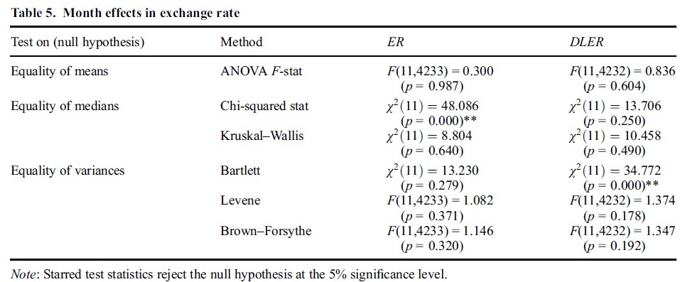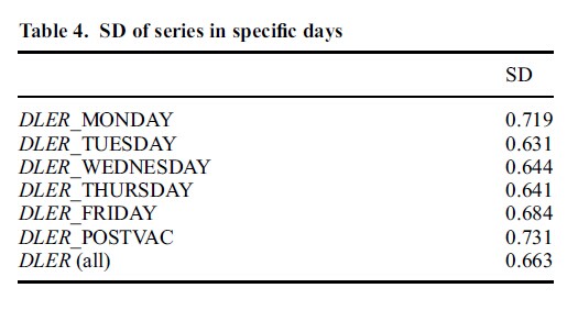 此外文章中还提到SD of series in specific days(周一到周五以及假日POSTVAC)(数据用的是欧元美元汇率的log后的一阶差分)