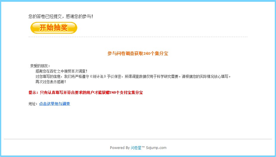 请将问卷完成页面截屏设为附件,设置价格20论坛币。如果在附件中符合要求并完成所有答题,我将购买。谢谢大家。由于数据收集的目的是为了写毕业论文,希望大家能认真填写,再次感谢。救人与危难之中,胜造七级浮屠。万分感谢。