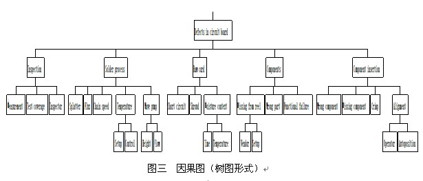 图一显示的就是一家印刷电路板公司在分析产品缺陷时使用因果图工具得到的一张以鱼骨图形式表现出来的分析图表。其中的“鱼头”就是QC小组面临的业务问题:Defects in circuit board,五个大“鱼骨”分别对应五大主要原因:Component insertion、Raw card、Inspection、Components和Solder process。再细分一下,可以发现更多地小“鱼骨”就是Aligment、Moisture context、Temperature等更多子原因。