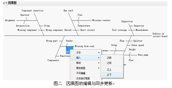 只要我们具备了这些意识,在操作层面上就很方便了,因为在JMP软件的“关系图”平台上,都提供了这些选项。例如,想在某个原因项下添加更细的子原因项,只要右击鼠标,选择“插入>之下”(如图二)就可以了。而且它不受原因层层数的限制,问到第十层(乃至更多层)的子原因都可以记录下来,适合QC小组边开会谈论边绘制并更新因果图。