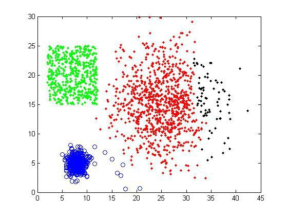 对样品组1使用average-linkage,选择聚类数目为4,可以得到下面的结果。右上方的一些异常点被独立地分为一类,而其余的数据点的分类基本符合我们的预期。