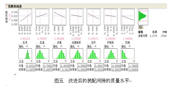 因此,我们决定将缸体的规格限由原先的8.50121±0.00468缩小为8.50121±0.00234(即标准差减小1/2),其他零部件的规格限保持不变,改进后的结果如图五所示。注意到此时用专业统计分析软件JMP模拟后得到的装配不良率降低到1.76%,PPM降低到17600,与改进前的质量水平相比,效果非常显著。当然,这个结果并不是最最理想的,不过,我们也可以延续刚才的分析思路,一步一步地找到改进的零部件对象进行改善并验证,直到获得令人满意的装配不良率为止。