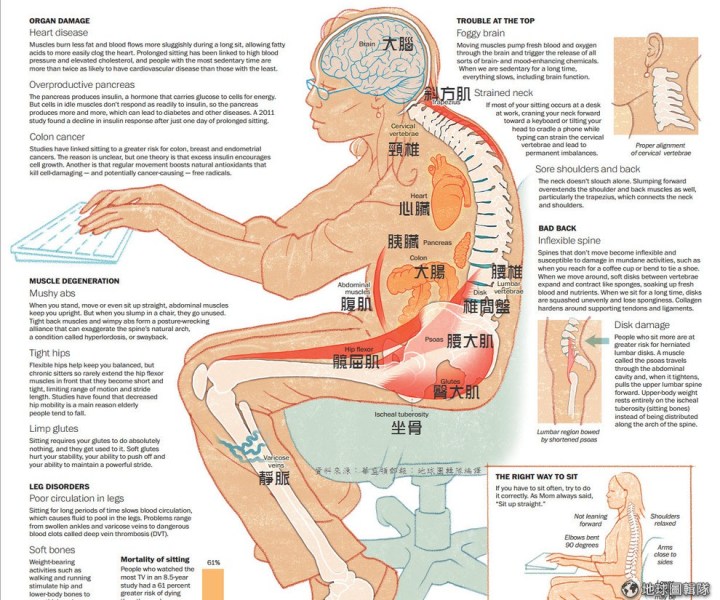 这边就有专家很干脆地用清楚图说告诉你,如果一天8个小时都坐在椅子上的话,不只是变胖那么简单,你的心血管、肌肉和大脑都会出状况。
