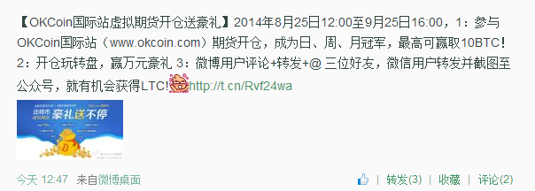 在 okcoin国际站上看到 从今天开始到9月25号,只要参与okcoin的 虚拟期货开仓活动, 成为日冠军和周冠军还有月冠军, 就有机会送得 10BTC的 好礼, 这个诱惑还是比较大的, 还是okcoin的活动很给力, 继续支持ok!