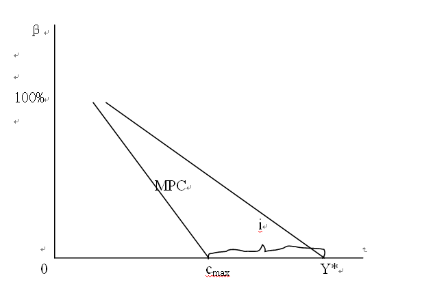 如图1所示,横轴表示一个经济体的收入Y,纵轴是以Β表示的边际消费倾向系数,MPC曲线上每一点代表这个经济体单位收入增长量对应的新增消费量的比率,即不同的收入水平对应不同的边际消费倾向,MPC曲线代表该经济体在不同收入水平边际消费倾向点的集合,被称为该经济体的边际消费曲线,因为边际消费倾向是递减的,因此边际消费曲线是向右下方倾斜的,当边际消费倾向系数为0时,边际消费曲线与横轴相交,表示该经济体消费需求得到最大化满足,即实现饱和消费时对应的收入水平。