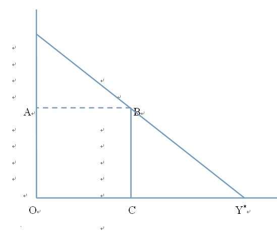 如图4所示,Y*点表示一个经济体在完全竞争状态下实现最大化均衡生产的规模,这时再生产利润曲线与y轴相交于Y*点,再生产资本利润率为0,再生产资金利率也为0。假设在此基础上开始新一轮再生产,这一轮再生产,再生产资金的供给在完全竞争状态,由于这是在实现最大化均衡基础上的再生产,由前面的推论可知,再生产资金供给利率为0,而再生产的组织,并非在完全竞争状态下进行,而是只有一个厂商独家垄断组织再生产,那么,这个厂商如何才能实现其资本利润的最大化呢?根据古诺模型,这时垄断厂商会以整个社会生产最大化均衡产量的一半,即C点作为自己再生产的目标规模。因为在C点,该厂商对应的再生产资本利润率为B,而其资本成本,即利率在资金供给完全竞争状态下的最大化均衡阶段为0,那么垄断厂商再生产的资本收益率与再生产利润率相等,等于BC,而厂商在再生产过程中的总体收益为矩形OABC。如果市场内有两个实力相当的厂商,根据古诺模型,均衡再生产规模将达到市场最大化均衡总产量的2/3,而社会上有m个厂商,均衡再生产市场总容量将为m/(m+1),厂商数量越多,均衡再生产规模将越来越大,厂商的超额利润越来越低,直至达到完全竞争状态,实现最大化均衡再生产。也就是说,只要组织再生产过程中存在资本收益,也即意味着存在相对垄断,就存在生产不足的情况,也即资源未被充份利用,也即社会不能实现充份就业。垄断程度越集中,生产不足情况越严重,资本收益率越高。ZF投资,相当于在资本集中形成相对垄断再生产组织体系中新增一个竞争主体,使社会再生产的总投资额比原来相对垄断状态下投资规模有所扩大,同样有助于一定程度上破解资本集中垄断造成生产不足的困局。