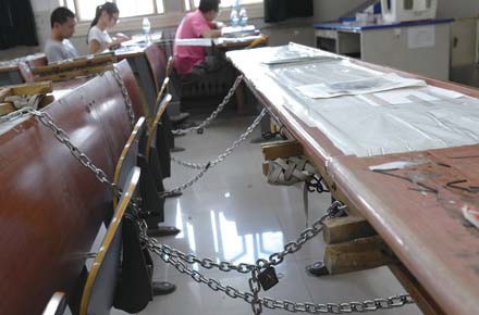 在济南大学第十教学楼5层,共有6间教室对自习学生开放。26日,记者在一间教室看到,几条长长的铁链将一排排桌椅捆住,不打开铁链上的锁便无法坐下。有的桌子上摆放了马扎,有的则用胶带封着板砖、石块,并贴着写有“重占拼命”、“血拼”的字条。