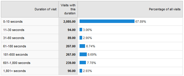 从图1我们可以看到绝大部分访问时间非常短暂,而少数人访问了大量时间,综合起来平均停留时间3分多,用3分34秒来做为一个关键判定点是不合适的。