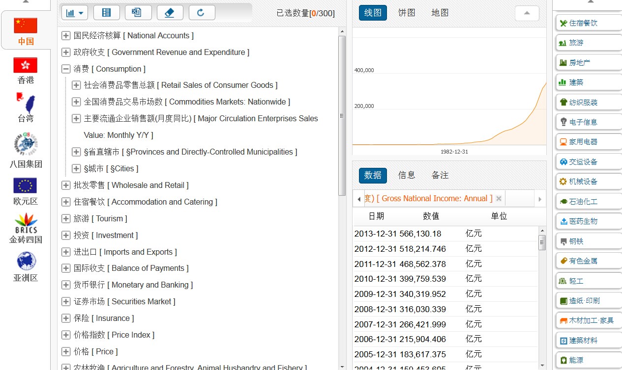 全球宏观数据:指标总量140万+,包括中国香港、中国台湾、八国集团(加拿大、美国、英国、日本、德国、法国、意大利、俄罗斯)、欧元区、金砖四国(巴西、中国、印度、俄罗斯)、亚洲区(日本、印度、韩国、新加坡、越南)的统计数据库,数据来源包含官方和非官方机构,覆盖全国、省份、地级市(288个)、县级市(2388个)的宏观数据。