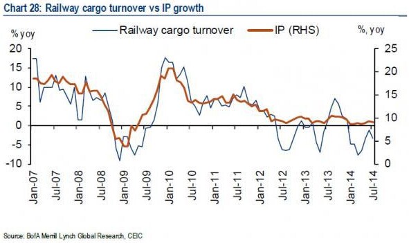 美国银行(Bank ofAmerica)对中国大宗商品价格动态的追踪图显示,与工业相关的中国主要大宗商品价格在全面下滑。尽管官方公布的中国二季度GDP增速为7.5%,但由于固定资产投资占中国GDP的50%以上,因此,用于资本投资的大宗商品价格通常可以显示中国经济更为真实的状态。上周,秦皇岛5500大卡动力煤价格为480元/吨,与前一周价格持平。库存降至560万吨,较前一周下降0.5%。图:动力煤价格和库存 8月份,中国六家主要发电厂每日煤炭消费同比下降22.5%,较7月16.3%的降幅明显恶化。图:六家主要发电厂每日煤炭消费情况 螺纹钢价格为每吨3058元,较前一周下降1.1%。34个主要城市螺纹钢库存量为547万吨,较前一周下滑1.9%。走弱的房地产市场、以及相对较高的钢铁产量的忧虑仍令螺纹钢价格承压。图:螺纹钢价格及库存 铁矿石价格为每吨88美元,较前一周下降1.9%。库存为1.12亿吨,较前一周增加1.4%。年初以来,铁矿石价格承受巨大压力,并很可能在房地产市场愈加疲软的背景下持续承压。图:铁矿石价格及库存 全国水泥均价为每吨347.5元,较前一周下滑0.9%。图:水泥价格走势 再来看看最具代表性的三项数据:电力、铁路和汽车:图:发电量和工业产出同比增速 图:铁路货运量及工业产出增速 图:汽车销售增速 不过,“猪仍在飞”。在经济增速萎缩背景下,中国可以承受的最后一件事就是不断飙升的食品价格。当前的猪肉价格已经处于较高水平 ,仅比2011年的峰值低了5元,这可能引发居民抱怨。上周,全国猪肉价格较前一周上涨2.3%,为每公斤23.3元。同时,猪肉/玉米饲料价格比小幅上扬至5.57,而养猪户盈亏平衡点为6。图:猪肉价格及猪肉/玉米饲料价格比 2014.9.3 华尔街见闻