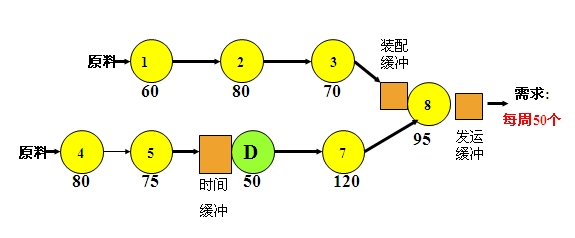 上边的例子上成品需要经过8个环节才能实现,每一各环节下边的数字是此道工序每周可以生产的个数。所以工序D是瓶颈。在TOC中由瓶颈的节奏(鼓)来决定生产计划,由绳子控制发料,由时间缓冲来防止墨菲效应,保证有效产出。