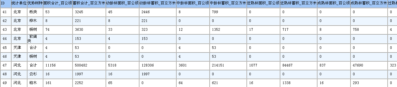 求第7次一类清查林业资源统计数据用材林不同林龄树种蓄积数据如下图,我给全部悬赏分