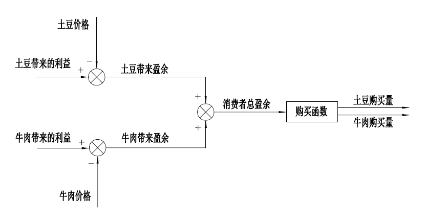 假设市场上只存在两种食物是牛肉和土豆,并且消费者认为牛肉的价值高于土豆,牛肉的价格也高于土豆。
