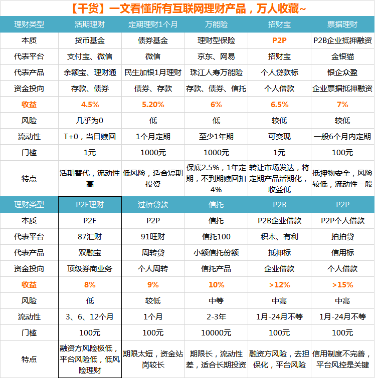 以余额宝为代表的货币基金,风险是所有互联网理财产品中最低的;以P2P、P2B为代表的民间借贷,风险等级是中高。