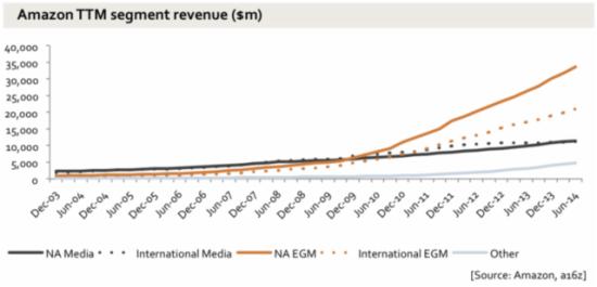 如图5所示,整体而言,在上个季度,媒体业务仅占亚马逊全部营收的25%;而在北美,这个比例是20%。