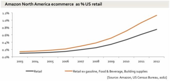 这种投资将需要持续多久呢?我们是否认为产品和业务向电子商务转变的过程已经结束了呢?让我们来考察一下亚马逊营收占美国全部零售营收的比例吧。除了汽油、食品和建材等难以运输的东西外,亚马逊的营收占美国全部零售营收的1%,至少现在是如此。