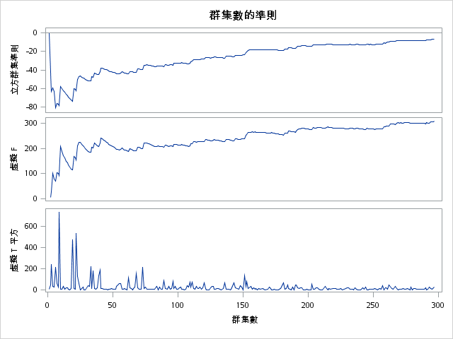 偽F統計量描述組間離散度/組內離散度,故該值愈大則合併至該數目愈佳