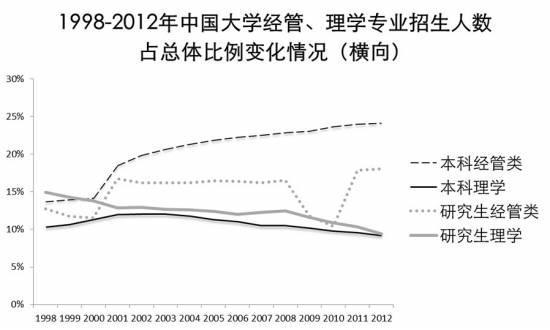 记者查阅了教育部(微博)公布的1998年—2012年本科、研究生各学科学生的分布情况,对比了经管专业和理学专业在招生人数上的变化后发现,在大学扩招的背景下,经管专业学生和理学专业学生规模均有所扩大,但经管专业招生规模增长速度明显快于理学的增长速度。15年间,经管专业本科、研究生招生规模均扩大了10倍,理学专业本科和研究生均仅增长4倍,远低于本科和研究生总体招生数6倍和8倍的增长规模。