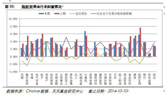 过去五个交易日股市震荡上行,中证全指收于3482.06点,与9月26日相比上涨1.08%。偏股型基金小幅加仓。截至2014年10月10日,统计成立一年以上的361只普通股票型基金和207只偏股混合型基金,普通股票型基金仓位平均测算结果为85.05%,较上周监测仓位上升1.36%;偏股混合型基金仓位平均测算结果为72.11%,较上周监测仓位上升0.51%。