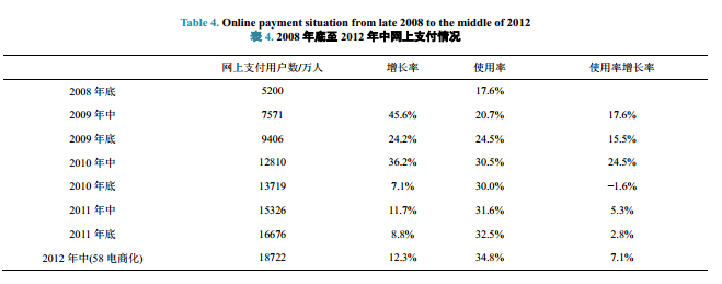 1) 电子商务市场的长足发展:2008 年到 2012 年年中,即 58 开始走上电商化道路时,网上支付的发展如表 4 所示:可以看到用户数量一直在增长,使用率也稳步提升,虽然 2010 年底 2011 年初,经历了增长低迷期,但 2012 年增长趋势再次回升,所以 58 同