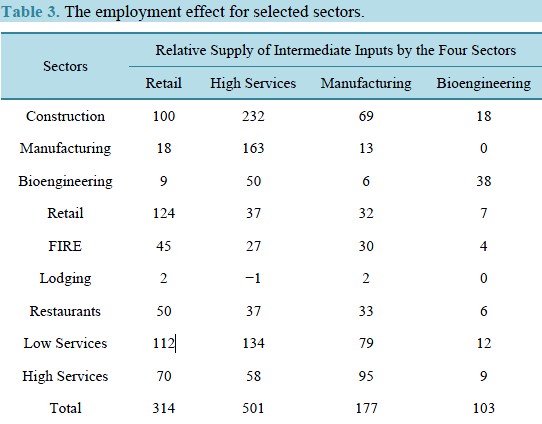第三,离岸外包通过服务业对美国经济的影响。高技术服务业占家庭消费预算的13%,其中间投入比例为6.8%。因此,将高技术服务业作为中间投入的行业,将受益于更低价格。服务业较低的进口价格会通过影响家庭消费、用作中间投入来影响经济。建筑和低端服务业使用了大量中间投入,比经济的其他行业扩展得都要快,因此具有表3中那样的就业效应。