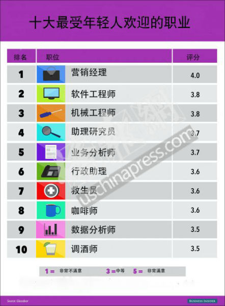 年轻人心里最关心的问题之一便是如何找一份能令自己开心的工作。综合过去三年里20至29岁的雇员在网站上对其工作的评价数据,美国大型求职网站Glassdoor整理出了10份最适合二十几岁的年轻人做的工作。