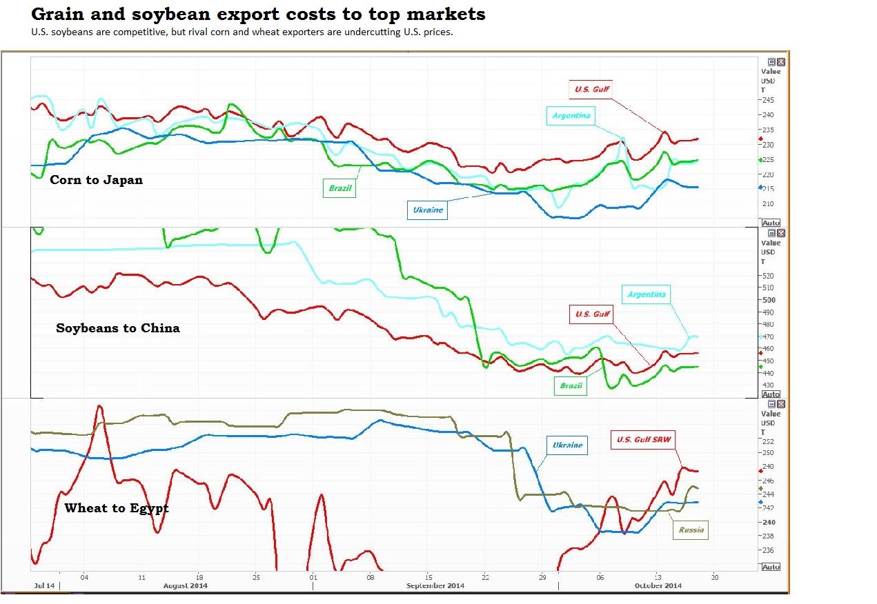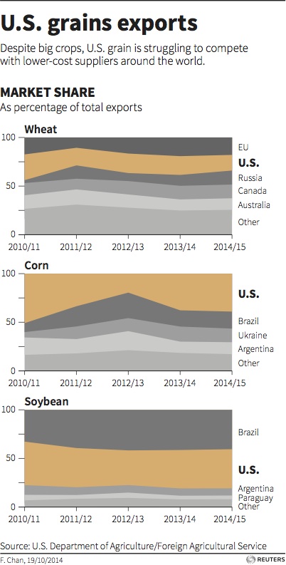 “乌克兰、巴西和阿根廷的玉米价格都比我们便宜,俄罗斯和其他地区的小麦也比我们廉价,”市场顾问公司AgResource主管Dan Basse称。