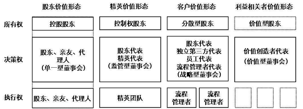 利益相关者价值形态治理结构中会出现价值型董事会,董事会主要由价值创造者代表组成,由于资本无形化,价值创造即时化,使企业的所有权、决策权、执行权能够相对统一,并逐渐集中在董事会,此时董事会功能在于维护企业人格特性,提高企业在市场生态中的价值特征,董事会的决策依据非常清晰,通过塑造一种独特的企业文化,维护企业与价值创造者趋同的人格特征,使所有价值创造活动与企业价值目标相同,因此董事会中形成一种组织人格决策形式,而任何价值创造者都有可能成为董事。