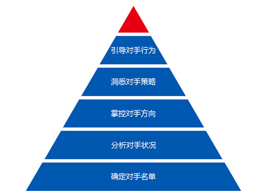 一个企业的策略如果是根据竞争对手策略来制定的话,这个企业是没有持续性的,每个企业策略应该具有企业自身的特色。分析竞争对手的目的是为了解对手,洞悉对手的市场策略等。我们可以用竞争对手分析的五个层次来说明,如图2所示。能准确地确定竞争对手,这是分析的最低层次,能分析出对手状况则是第二层次,最高层次是通过竞争分析制定策略后能够引导对手的市场行为。