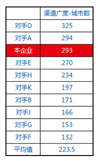 适用于对单个指标的若干个对象强弱分析时使用,例如我们对渠道广度这个指标分析时,可以对竞争对手进行排行,从而看出竞争对手间渠道广度强弱,如图4所示。