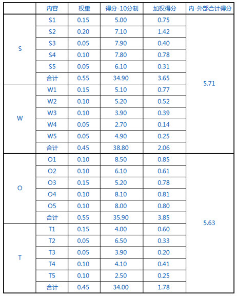 行业不一样、企业不一样这25个问题也会不一样,每个企业可以根据自己的特性进行调整。我们需要通过这些问题来对SWOT进行量化处理。如图6所示,结合收集到的竞争对手情报,对25个问题分别进行打分,然后设定不同问题的权重,最后就得到SWOT以及SW、OT的综合得分。