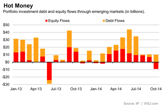 Take the so-called “taper tantrum” that rocked emerging markets across the board last year after U.S. Fed officials changed market expectations about U.S. interest rates. In the weeks that followed the Fed’s May signaling, equity, bond and currency markets in industrializing nations plummeted, some losing more than 20% of their value, as investors pulled out cash.