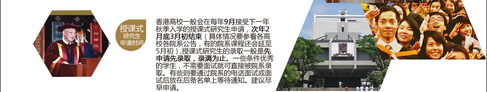 研究生:申请人必须持有认可大学颁授的学士学位,应届毕业生在课程开始之前若能获取所需学历资格亦可申请入学。此外,某些学位课程会有更具体的要求,会通过安排笔试或面试进一步测试申请人就读该课程的能力。
