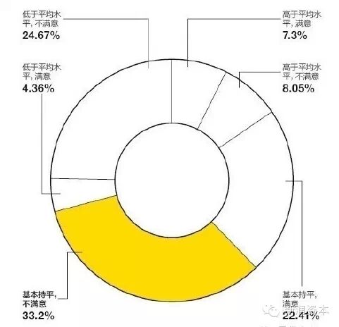 在“与所在城市的生活水平相比,你感觉自己的生活水平怎么样?”的调查中,33.2%感觉“基本持平,不满意”,25%的人表示“低于平均水平,不满意”,23%的人表示“基本持平,满意”。可见,“80后”虽然心态积极,但幸福感普遍不强。