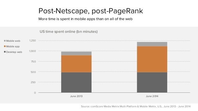 除此之外,App 正在抢占人们以往消耗在 Web 上的时间。通过计算机访问 Web 的时间在 2013 年和 2014 年并没有多少变化,然而花费在移动端 App 和移动端 Web 上的时间则在迅速增长,其中 App 的变化尤为明显。