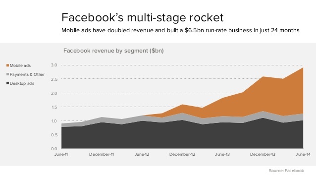 互联网广告也面临移动广告的冲击。看看下图 FaceBook 的多级营收模型,最底层的互联网广告收入和中间层的其他付费收入一直没什么变化,但引入最上层的移动广告,短短 24 个月的时间就使得整体收入翻了一倍。