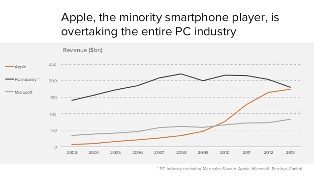 而移动世界里的主力军苹果,则在逐渐的把整个 PC 产业甩在身后。