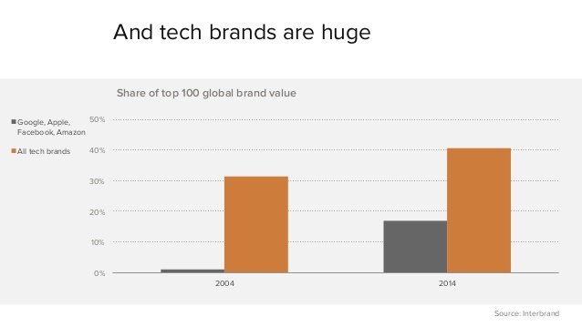 科技公司的品牌正在变得越来越有影响力,在 2004 年的时候,100 强全球品牌中科技公司占的比例还很小。到了 2014 年,google、苹果、FaceBook、亚马逊等科技品牌让这个比例增长到了恐怖的 15% 多。