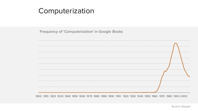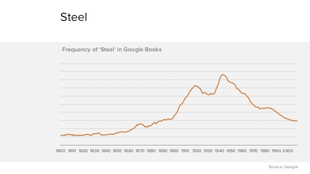 下面这些图是 google books 里面一些词语出现的频率曲线。可以看出,railway、steel 这些词语在刚出现的时候会越来越多的被人们所提及,而当这些东西被人们见怪不怪后,谈论的频率会越来越低。computerization 和 software 这两个词语也是一样,因为人们越来越多习惯这些东西的存在,当所有的公司都是 computerization 和 software 的,人们就会习以为常的忘了这两个词语。换句话说,software 那时已经不知不觉的吞噬了这个世界。