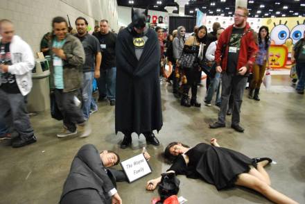 14、两位粉丝将自己COS成了韦恩夫妇,每当看到一个蝙蝠侠coser就立刻冲上去大喊一声孩子啊扑倒在地,并将钱包珍珠项链等洒落在地还原出布鲁斯韦恩最不想回忆起的一个场景,深深地伤害了现场每一位蝙蝠侠coser的心灵。coser何苦为难coser,人与人之间最起码的善意都没有了!