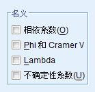 点击Statistics钮,在出现的对话框里,选择“名义”框组的一个或几个系数(如图)