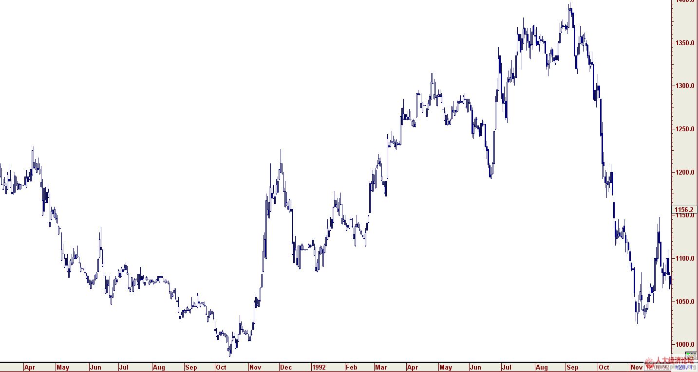 图上可以看出,92年前所有的跌势都是抵抗的阳线。懂期货的人应该清楚,这是不可能的。
