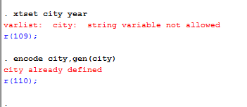 mengyang5757 发表于 2019-4-28 12:25 stata在设定面板数据时 ,设定失败,个体变量(城市city)无法识别,如下图,求大神指点!!