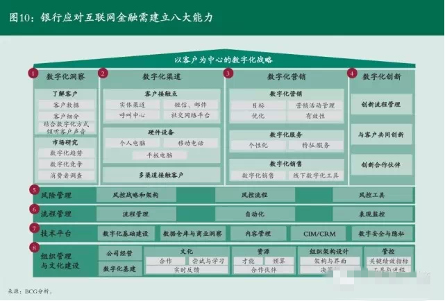 前文在谈及客户的改变时已经提出了一个概念——即“金融的生活化”。这个概念是指金融不是独立存在于人们的生活中,而是嵌入在众多的生活场景中,让人感受不到金融的存在,可它实际上又无处不在。因此,互联网金融版图的扩张实际上依靠两个维度的扩展,一是扩大目标客群,二是占领客户的生活时间。扩大客群的方法有很多种,比如地域的扩张、年龄层的扩张、财富层的扩张等等。而占领客户的生活时间则需要占据尽量多的应用场景,即流量入口。据BCG“数字化新世代3.0”研究显示,占据用户上网时间流量最多的是娱乐、沟通、信息获取和电子商务这四大类活动。(参阅图7)互联网金融巨头们对客户时间的争夺也紧紧围绕这几大领域展开。(参阅图8)