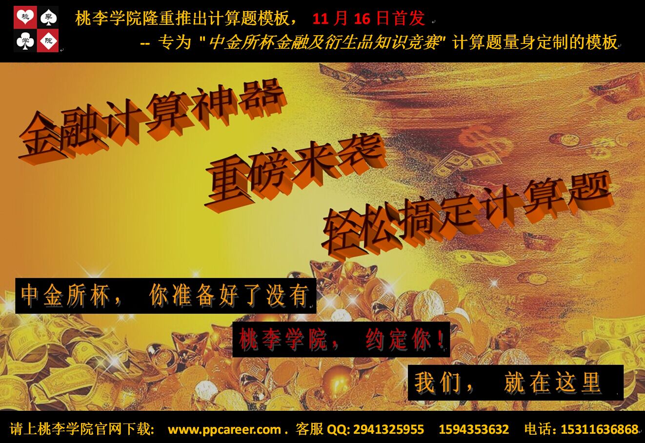 参加了中金所杯,昨天从桃李学院 ppcareer买了计算题模板, 很好用, 刚好可以用在中金所杯上, 计算题做起来快了几倍,推荐给一起考中金所杯和金融考试的同学们,省了好多时间!