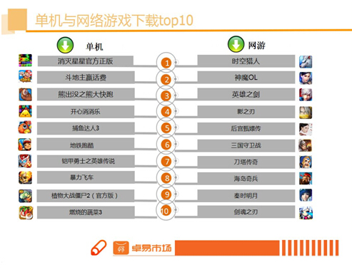 据10月份报告显示,《时空猎人》《神魔OL》和《英雄之剑》三款游戏位列网游下载榜前三甲,而单机方面《消灭星星官方版》领跑榜单,《斗地主赢话费》依旧表现不俗占据第二,跟据动画制作的游戏《熊出没之熊大快跑》占据第三。