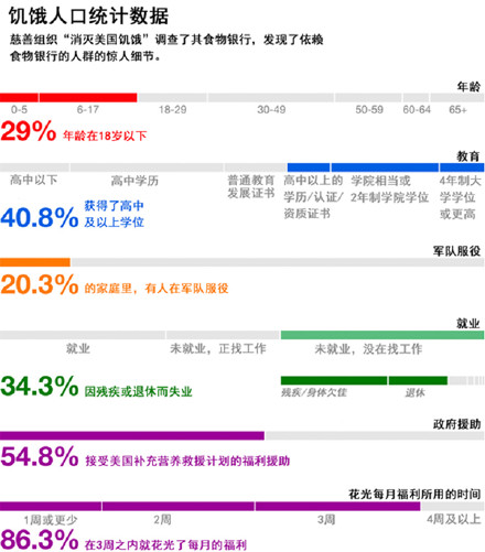 “这份饥饿排行榜中包含有1200万儿童和700万老年人,还有数百万贫困工薪家庭、军属家庭、失业者及年轻的大学毕业生们。每一个群体的人们都说对食物援助计划的依赖,源于其对健康和营养食物的对比。当他们对比时,他们发现他们只能买得起便宜的加工食品,而这些食品总是会带来一系列的慢性疾病,如