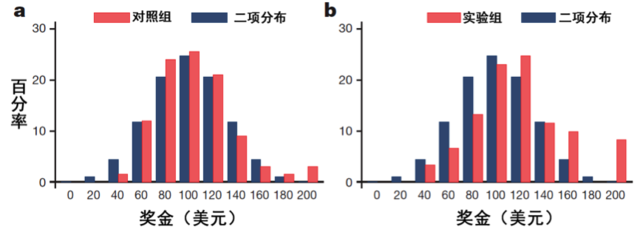 实验组和对照组报告的奖金与奖金的二项分布对比。图片来源:研究论文