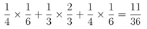 把这三种情况综合起来,第一个和第三个时间段长度分别是总时长的 1/6 ,第二个时间段长度是总时长的 2/3 ,我们就可以得到最终碰面的概率是: